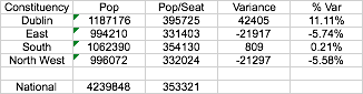The table shows the population and variance of each of the new Dublin constituencies. As we expect most of the constituencies have a slightly positive variance. This is due to the region being under-represented by 0.4 TDs which was felt a reasonable thing to do to increase slightly the representation in Connacht/Ulster earlier on.Local Tweaks